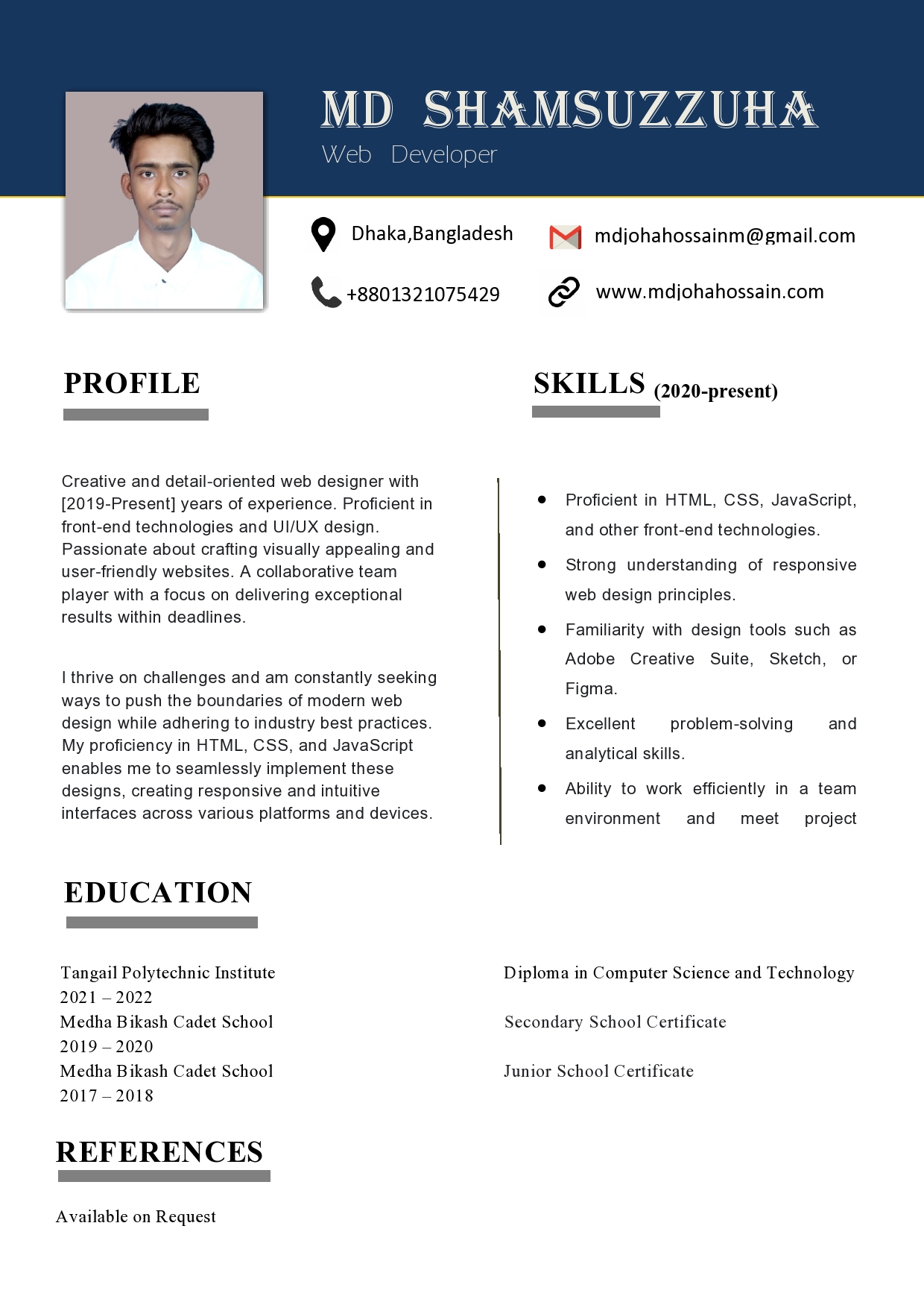 Hello, I'm [Md Shamsuzzuha], a passionate and creative web designer with a flair for crafting visually appealing and user-friendly websites. With [2019 to present] years of experience in the industry, I've honed my skills in web development and design, making me proficient in HTML, CSS, JavaScript, and various design tools.